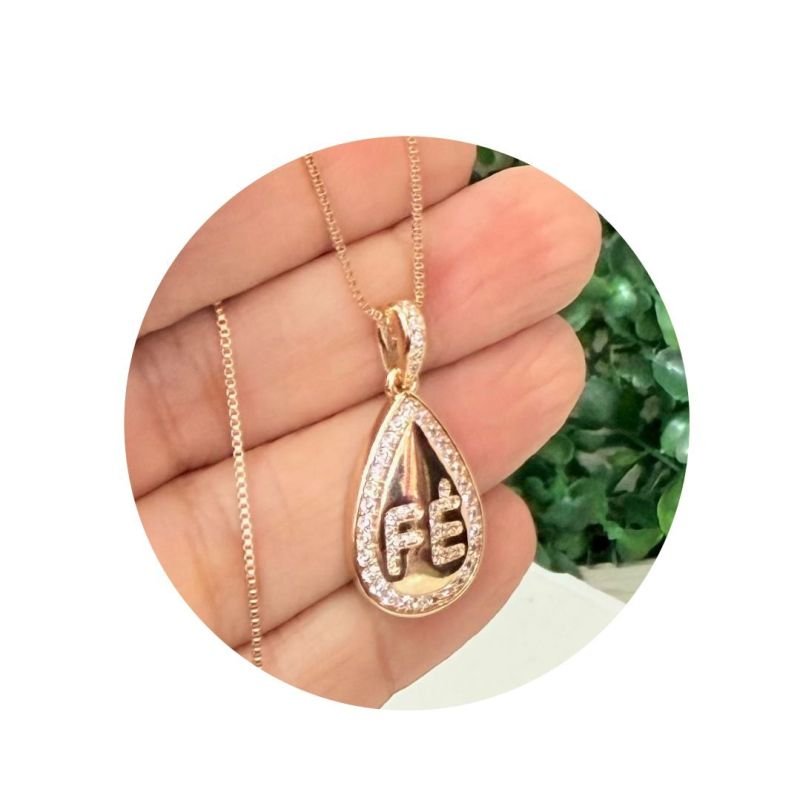Colar escrito fé, gota com zirconias, folheados a ouro 18k.Tam corrente: 45cm + 5cm prolongador